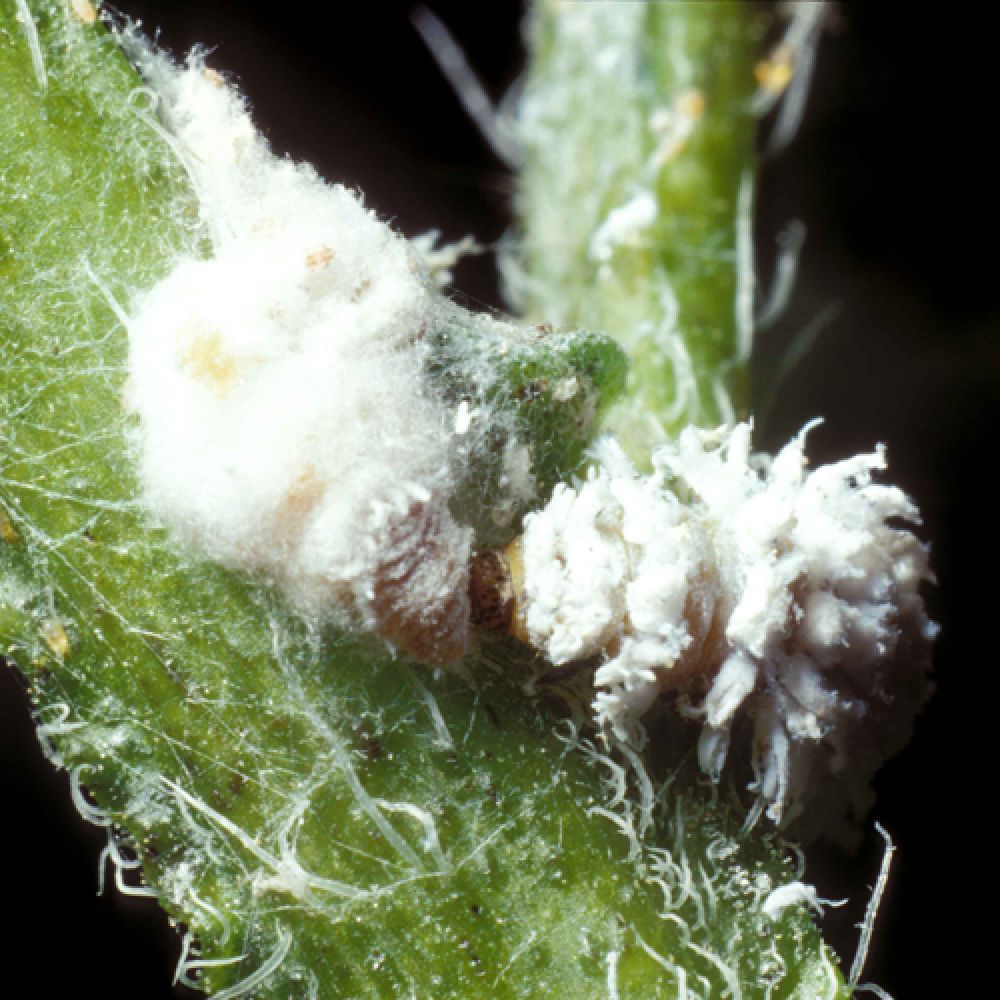 Berührt man Pflanzen und es fliegen weiße Mücken auf, so handelt es sich um Weiße Fliegen. Sie sind ca. 2 mm groß und mit Wachsstaub bepudert. Auch hier muss man die Art kennen, um die richtige Schlupfwespe einsetzen zu können. Nach erfolgter Parasitierung verfärben sich die Nymphen der Weißen Fliege schwarz.